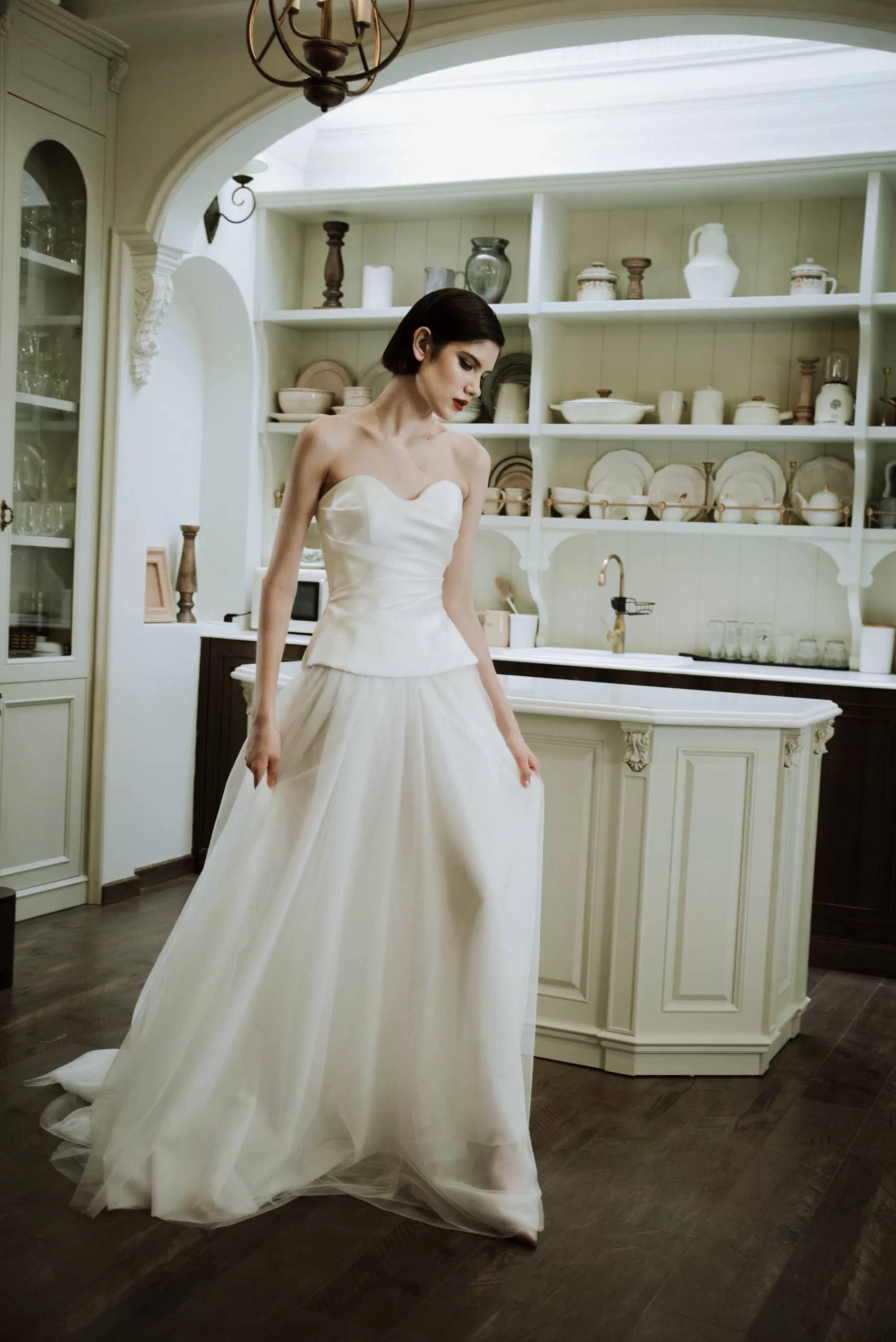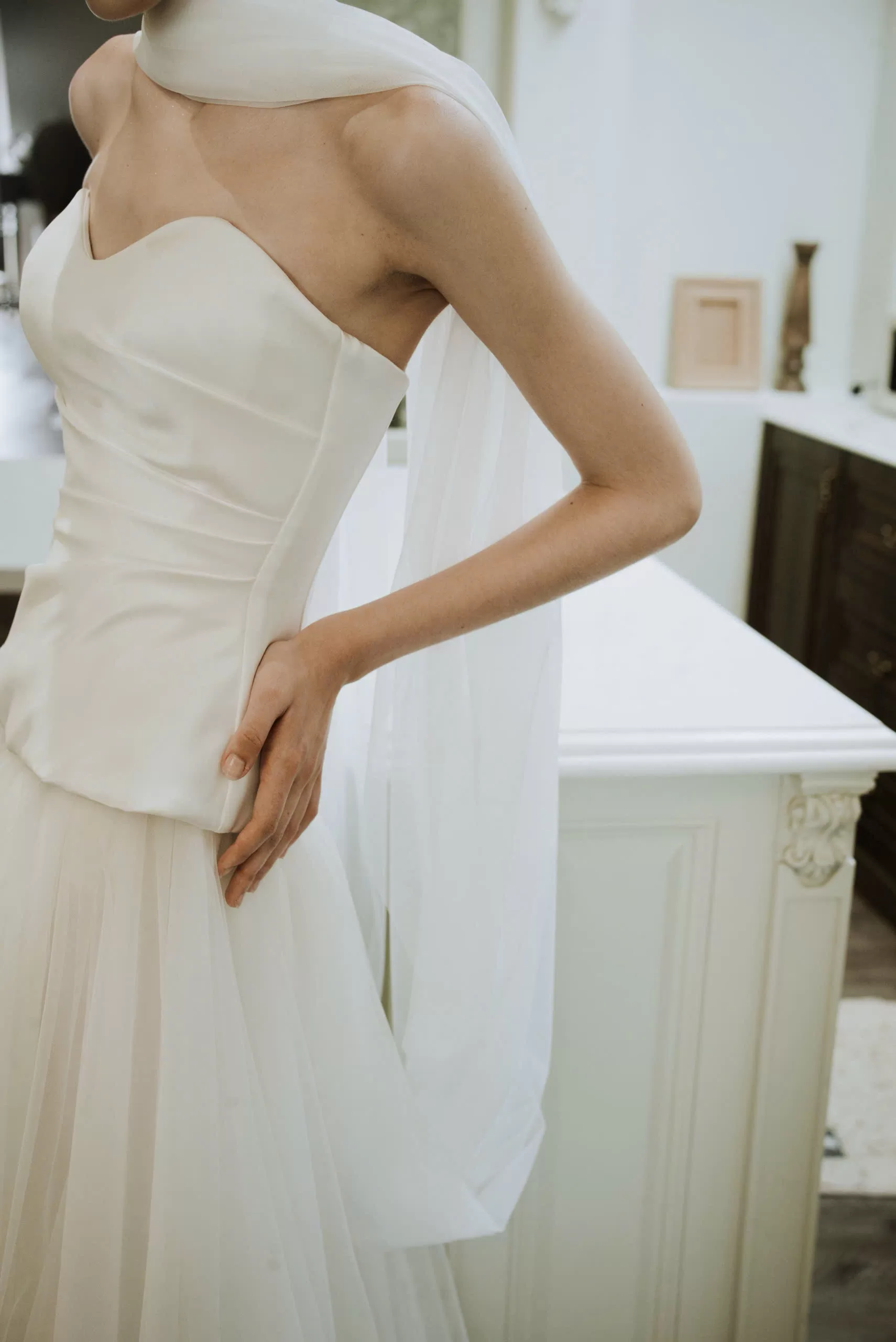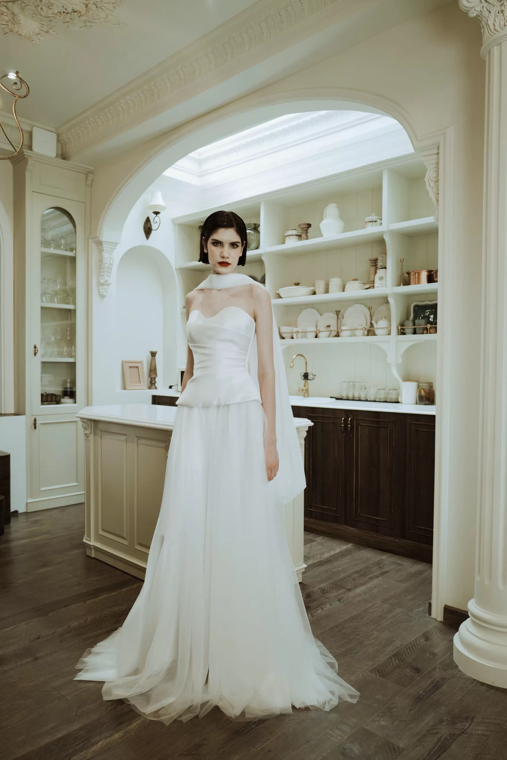 Thiết kế váy cưới với corset tinh tế ôm trọn vóc dáng nàng dâu, kết hợp cùng tùng váy