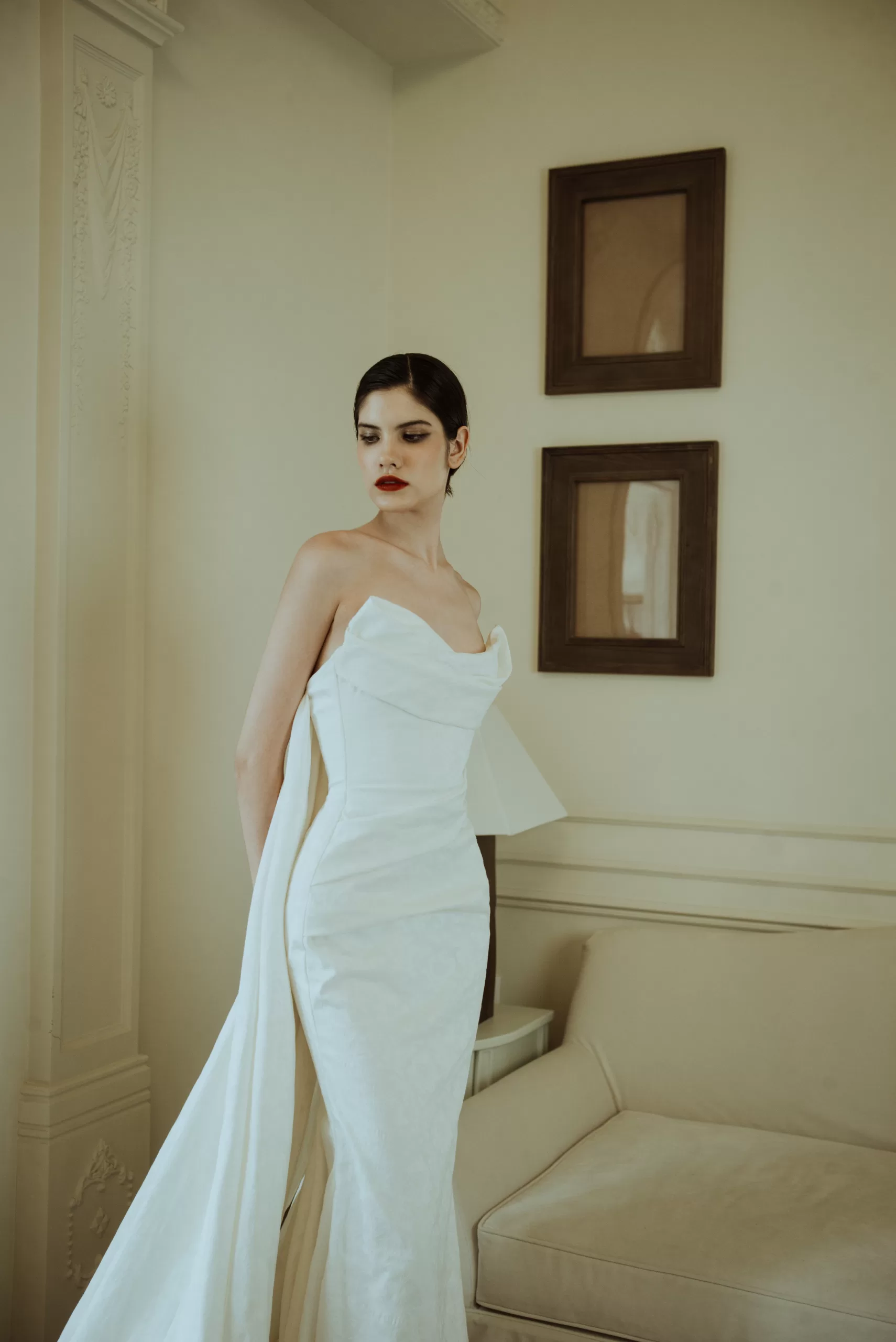 Thiết kế váy cưới cúp ngực tinh tế, được chế tác từ chất liệu gấm cao cấp. Dáng váy suông