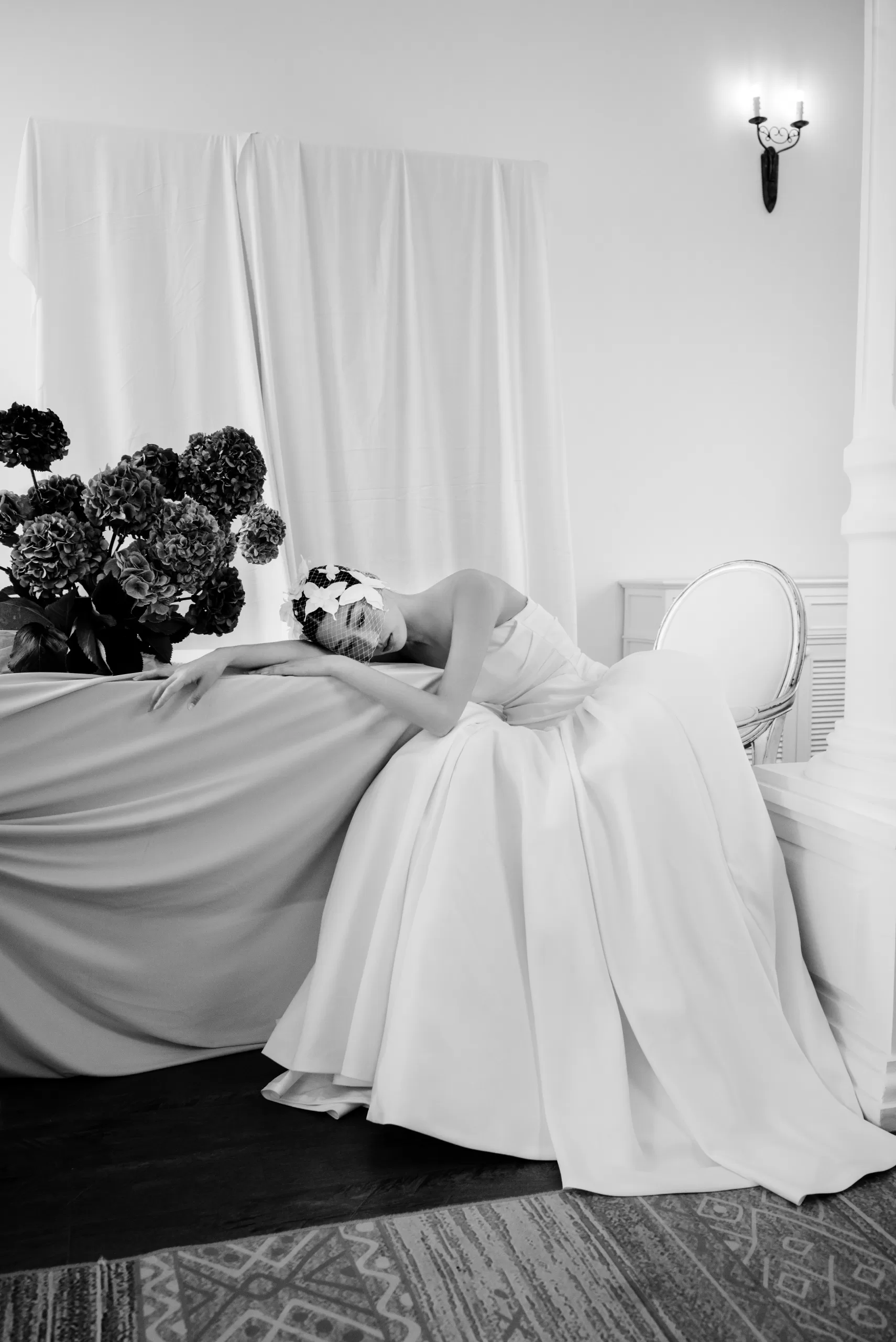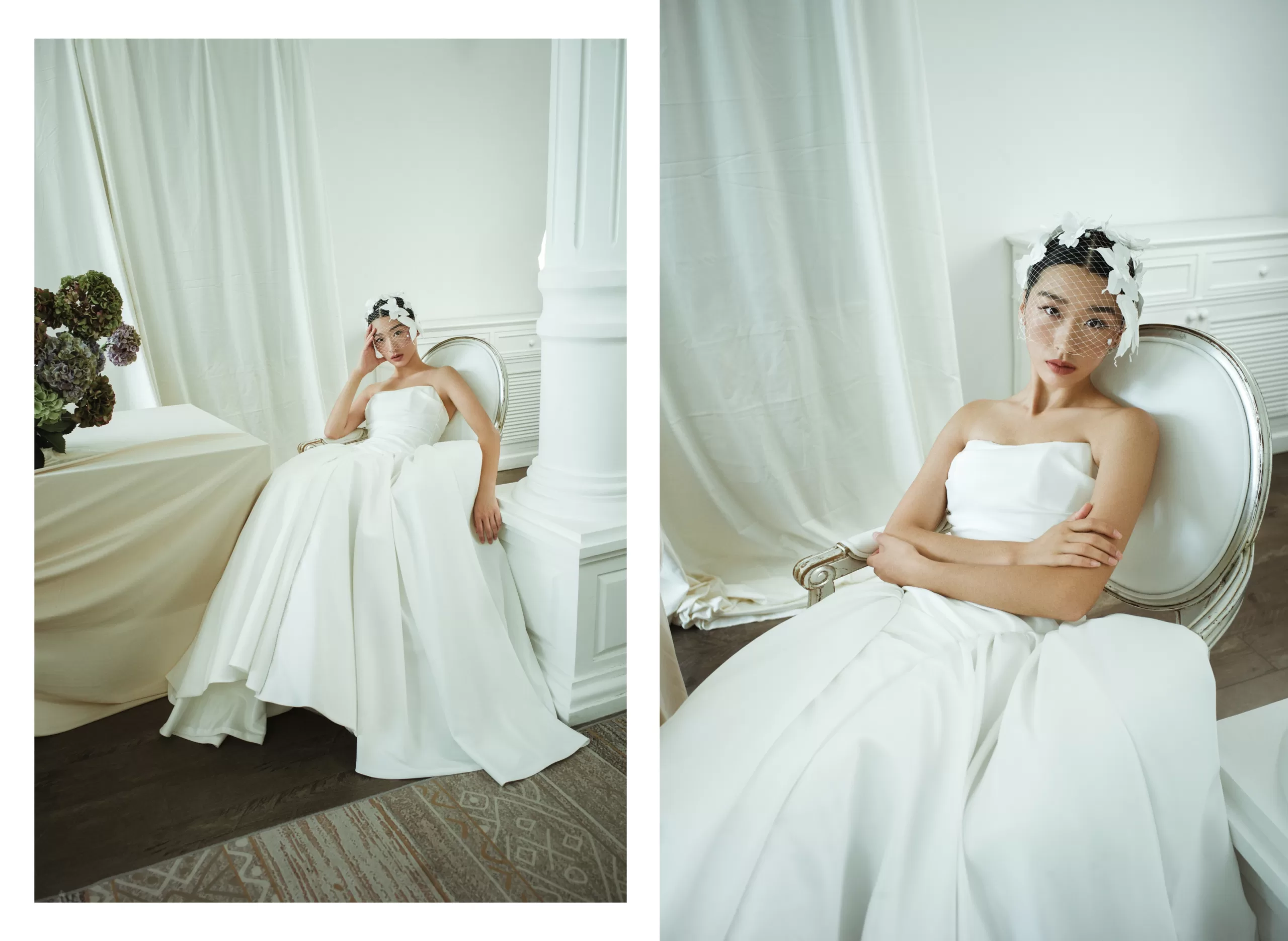 Váy cưới cúp ngực trên nền satin mềm mại, với điểm nhấn hạ eo tinh tế tôn lên vòng hai