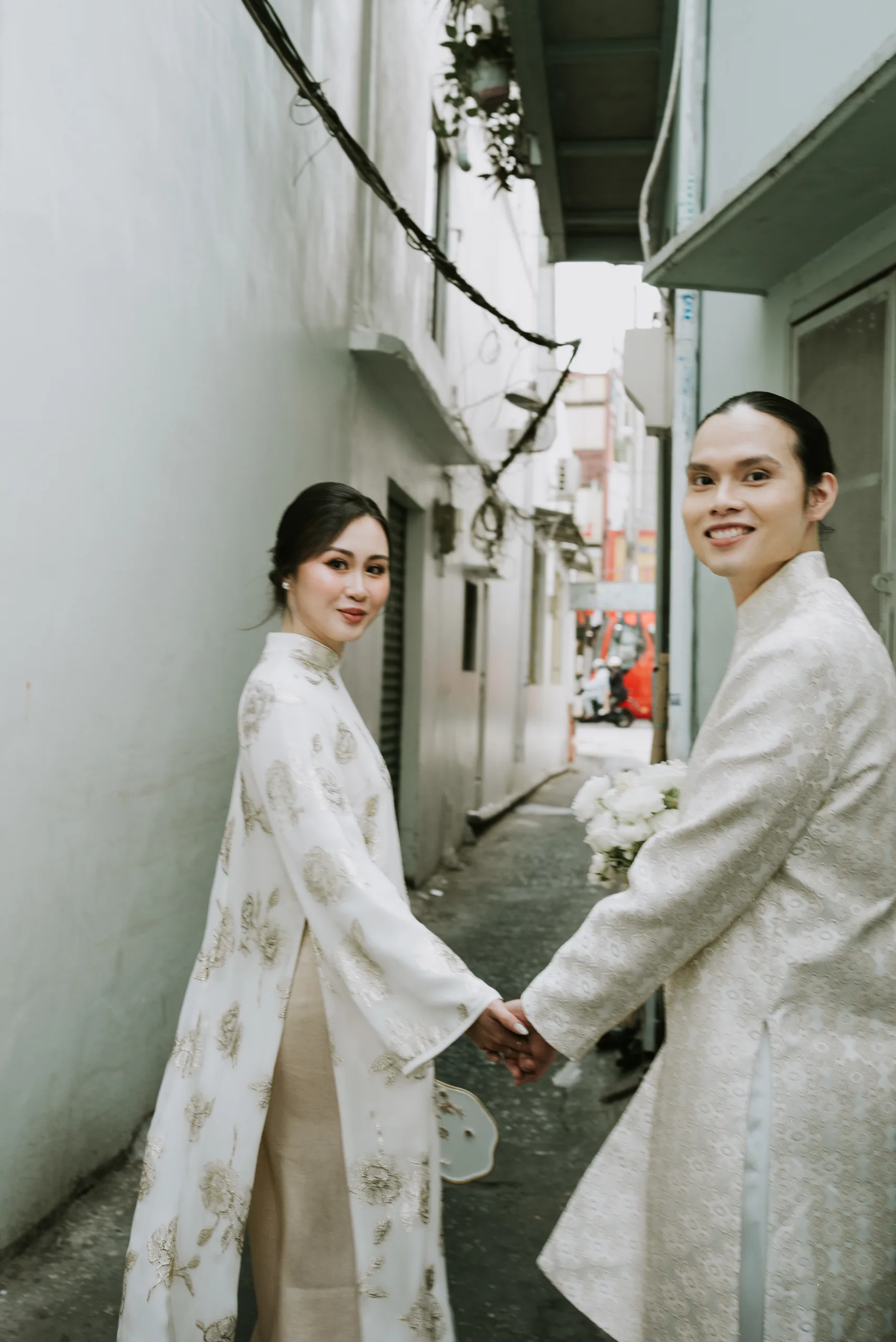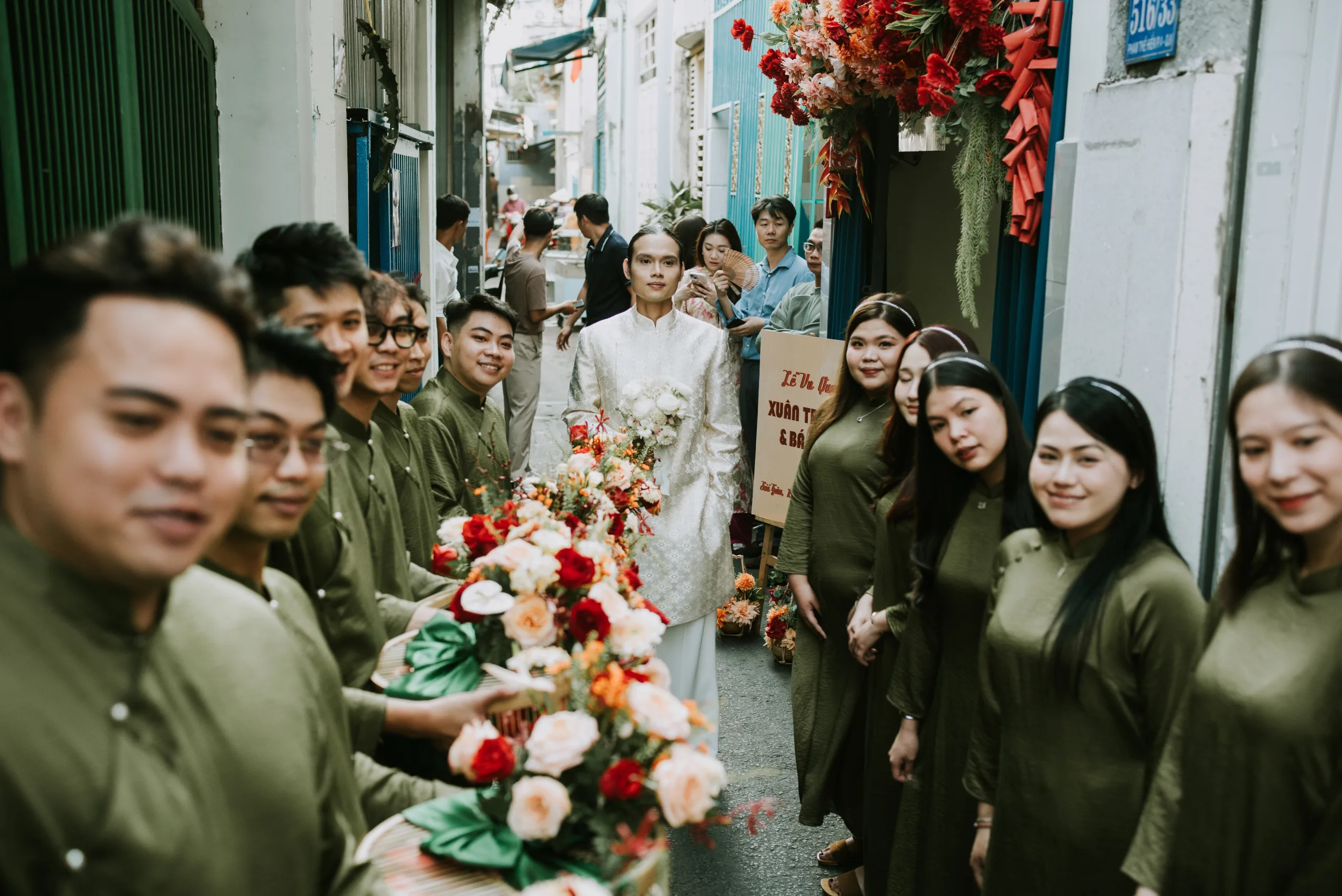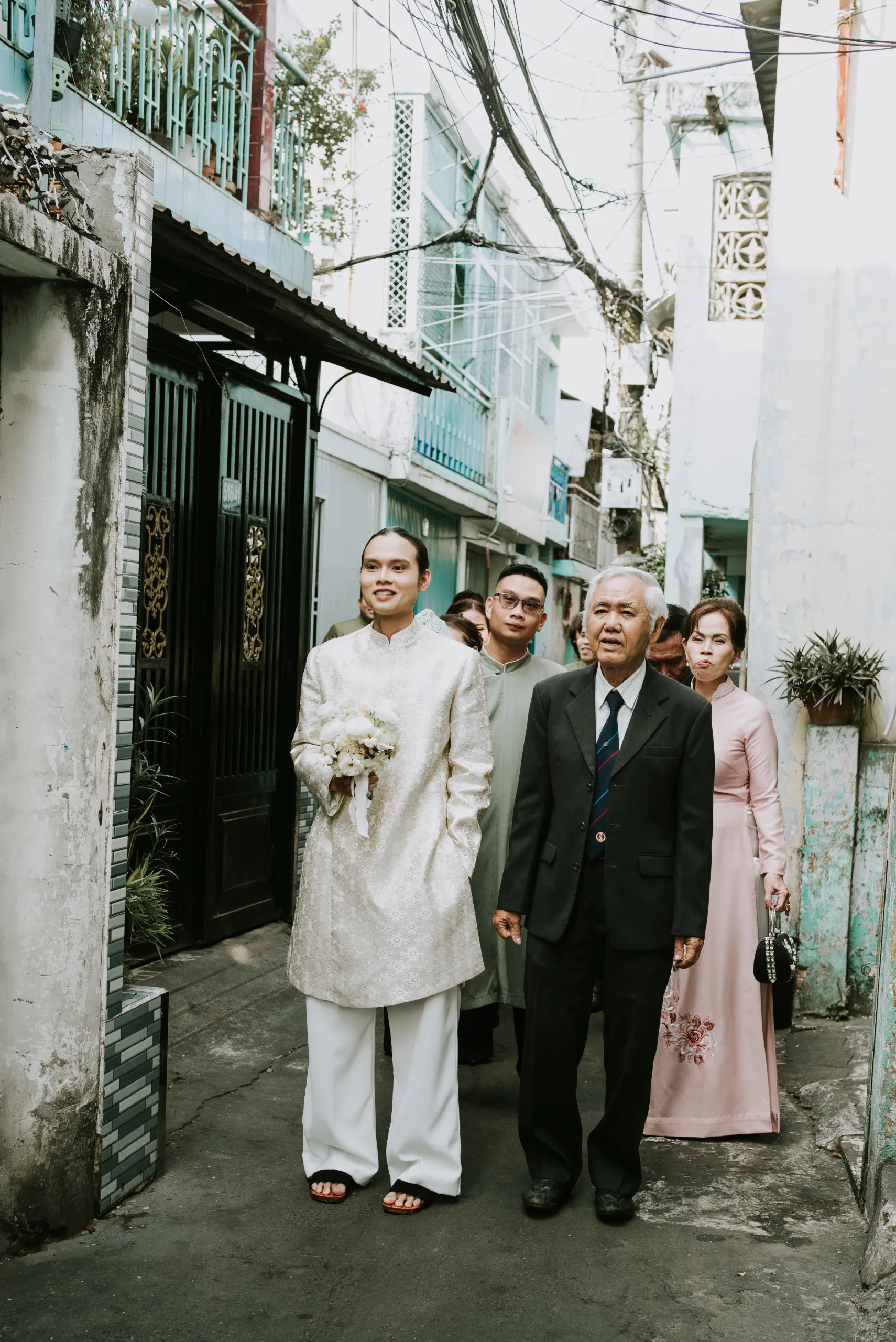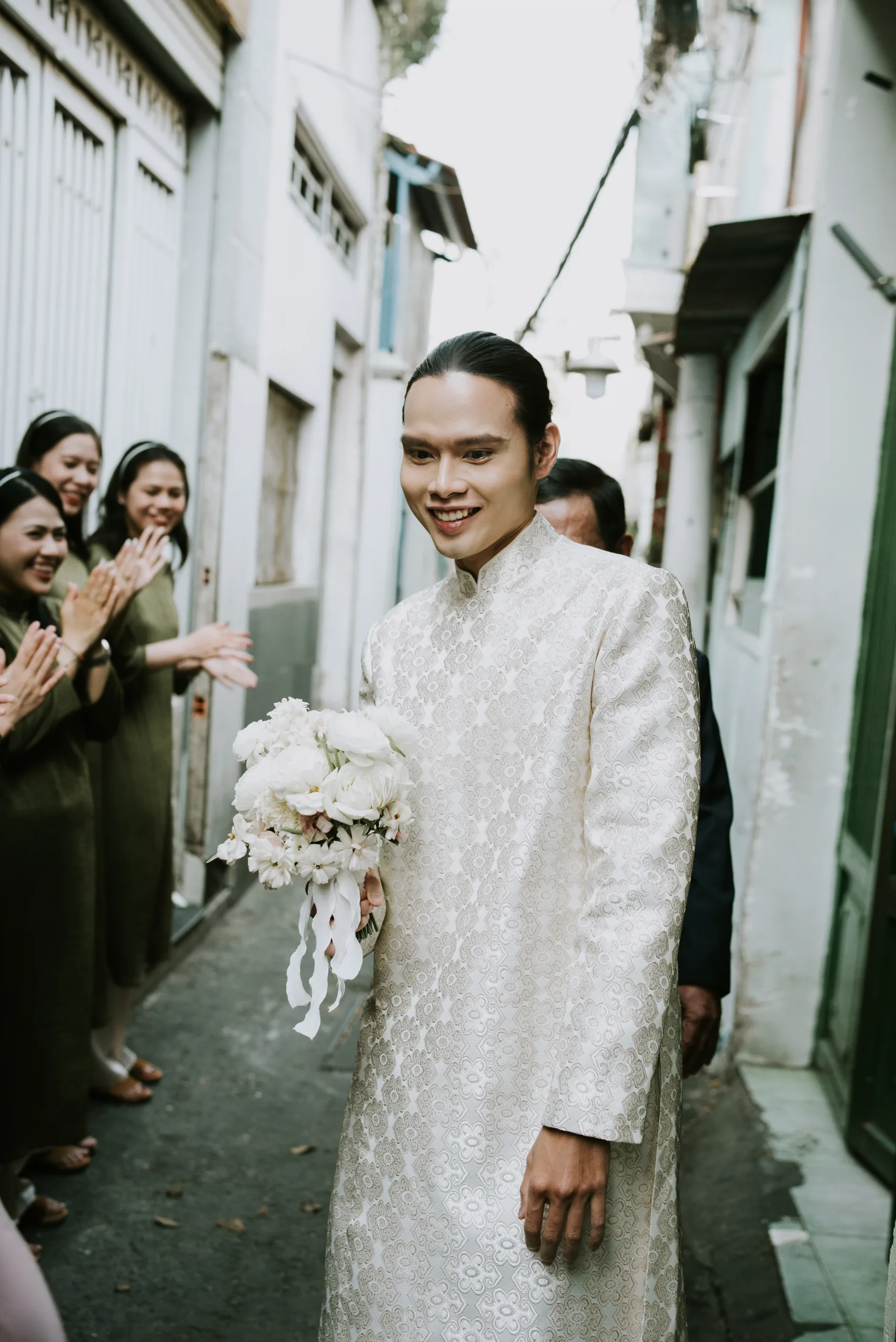 Cô dâu dịu dàng với tà áo dài trắng họa tiết cổ điển, cùng chú rể rạng rỡ dẫn đầu đoàn rước lễ