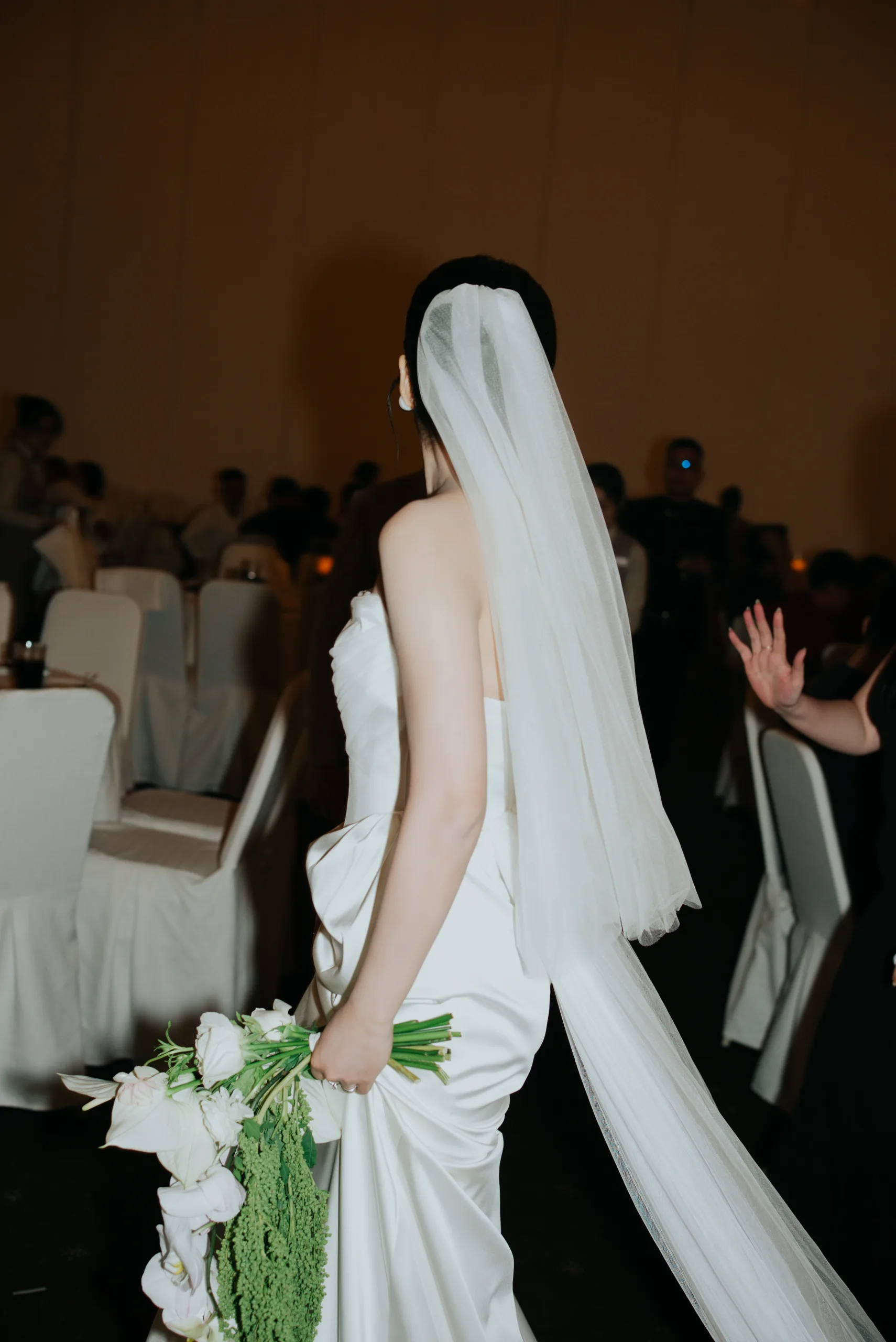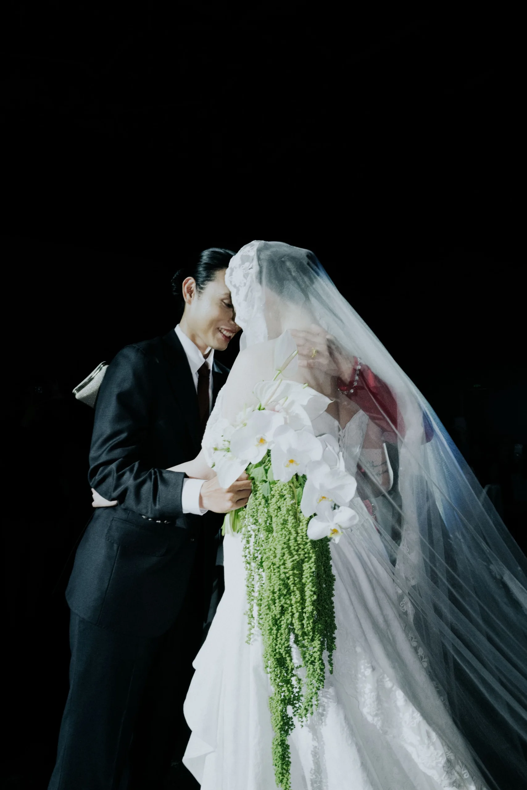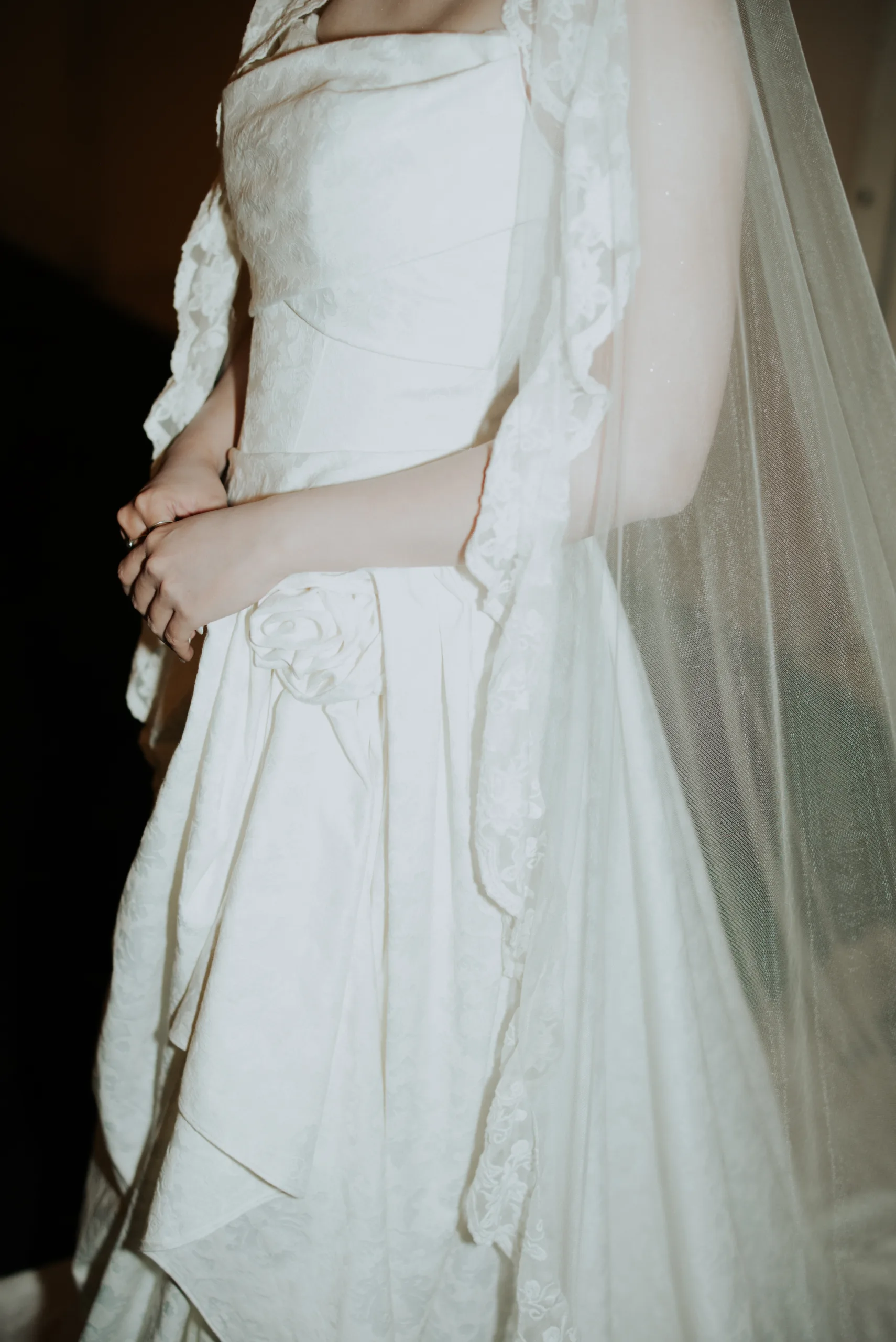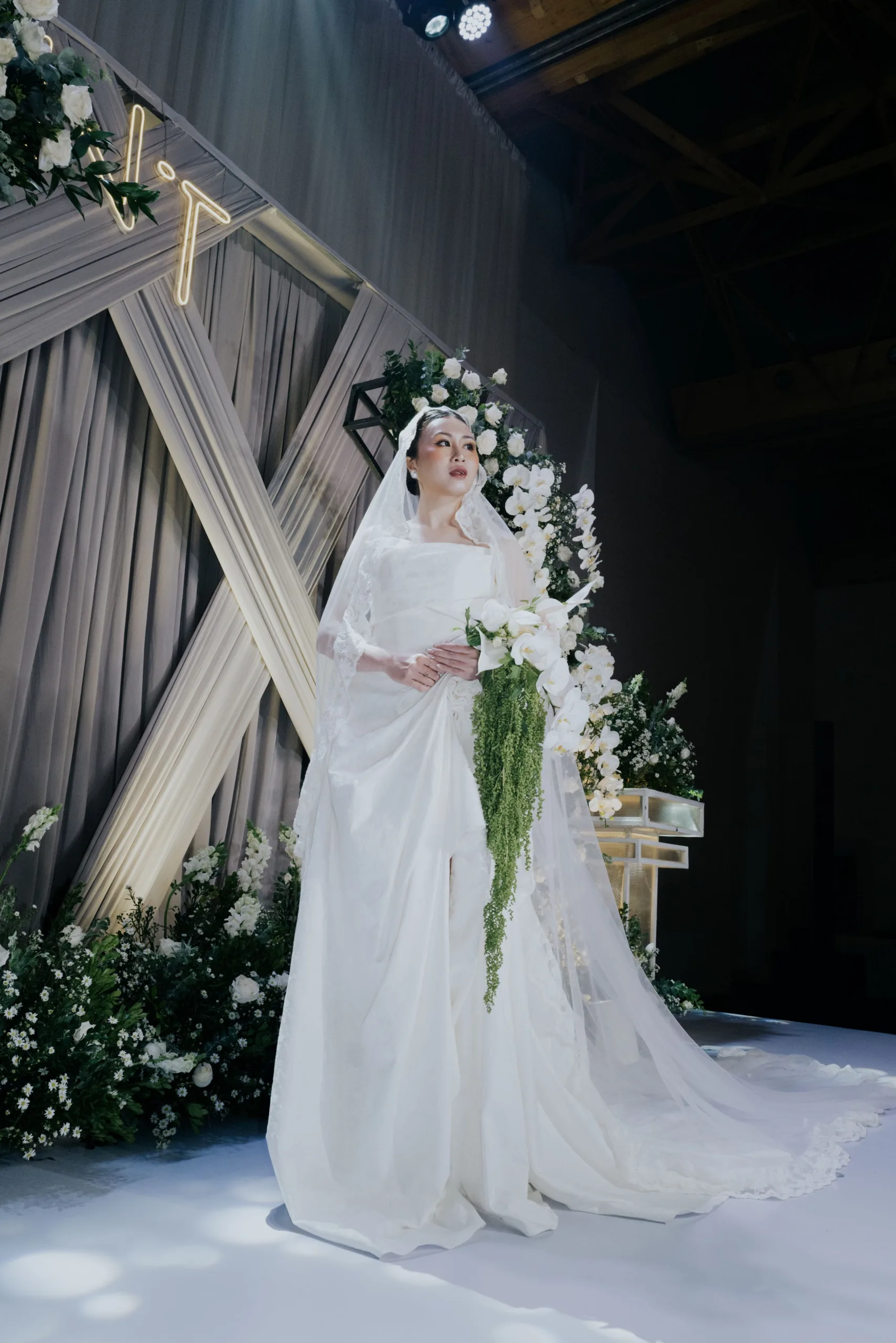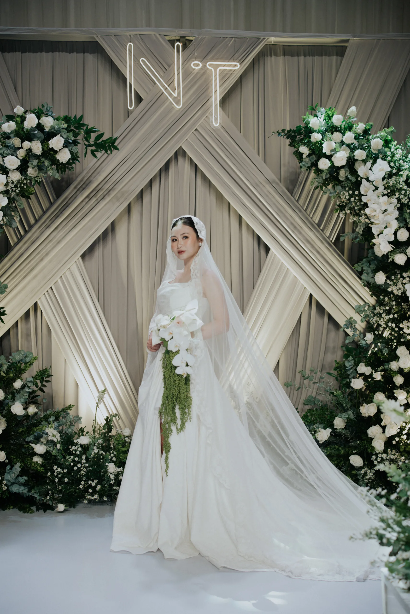 Cô dâu dịu dàng với tà áo dài trắng họa tiết cổ điển, cùng chú rể rạng rỡ dẫn đầu đoàn rước lễ
