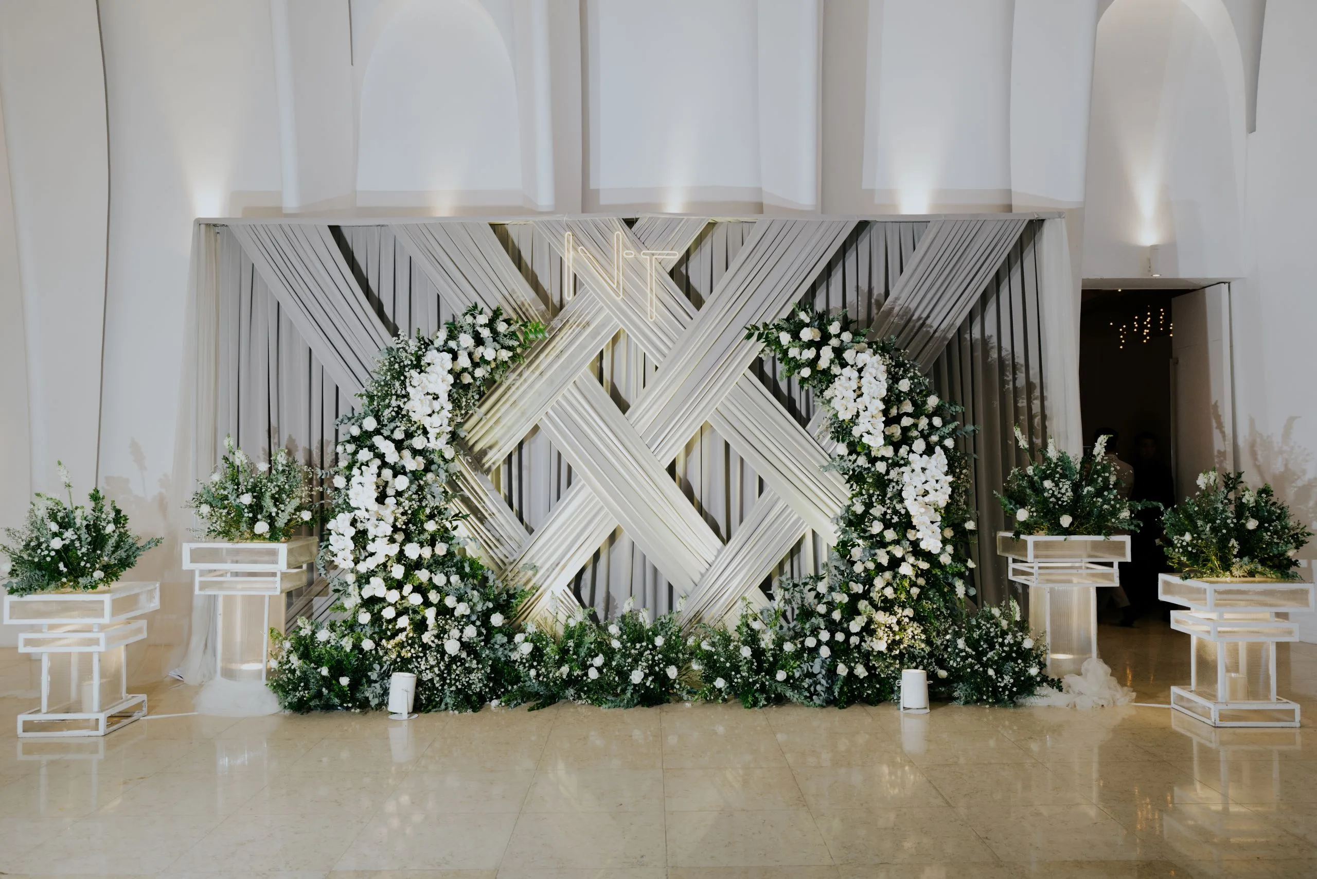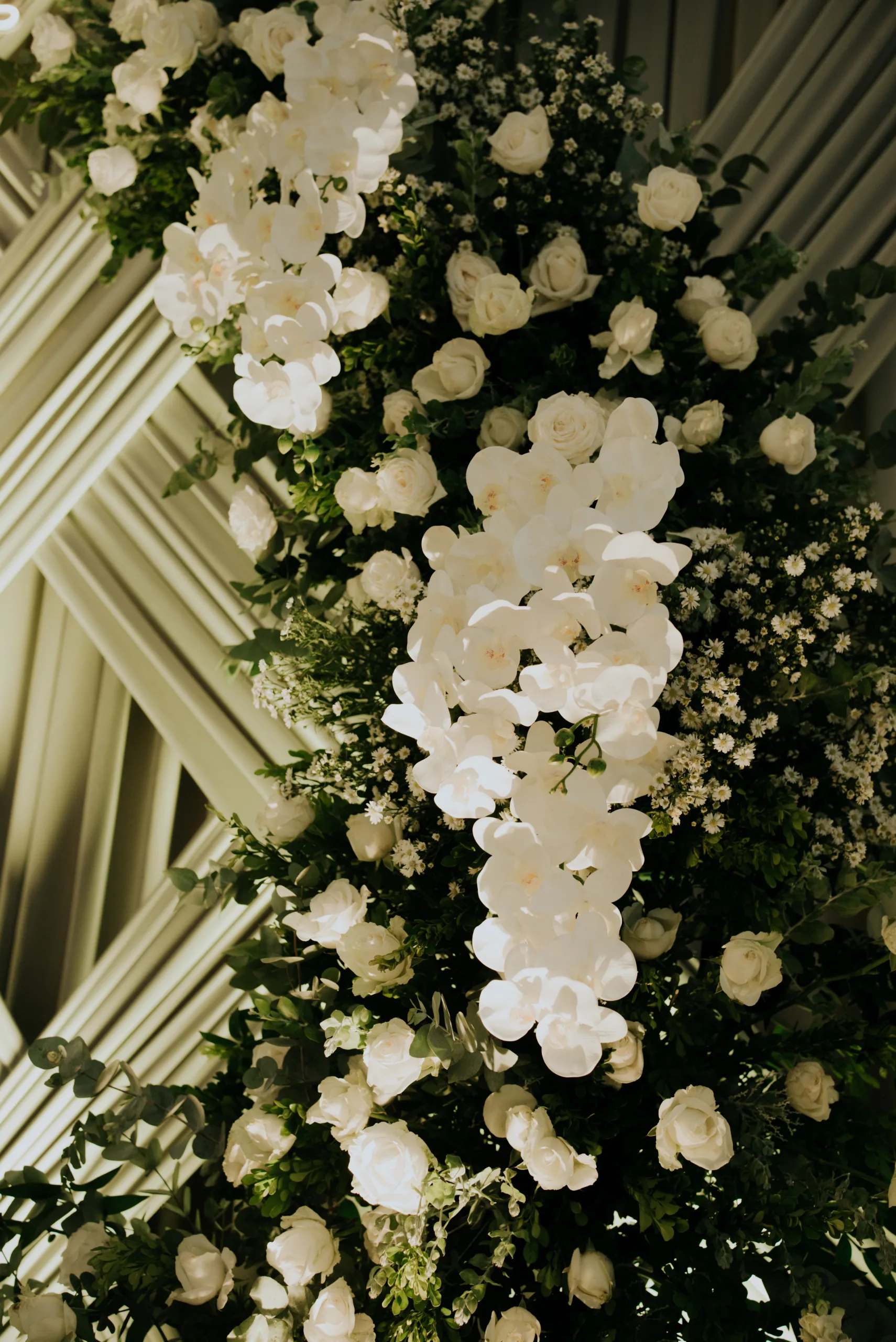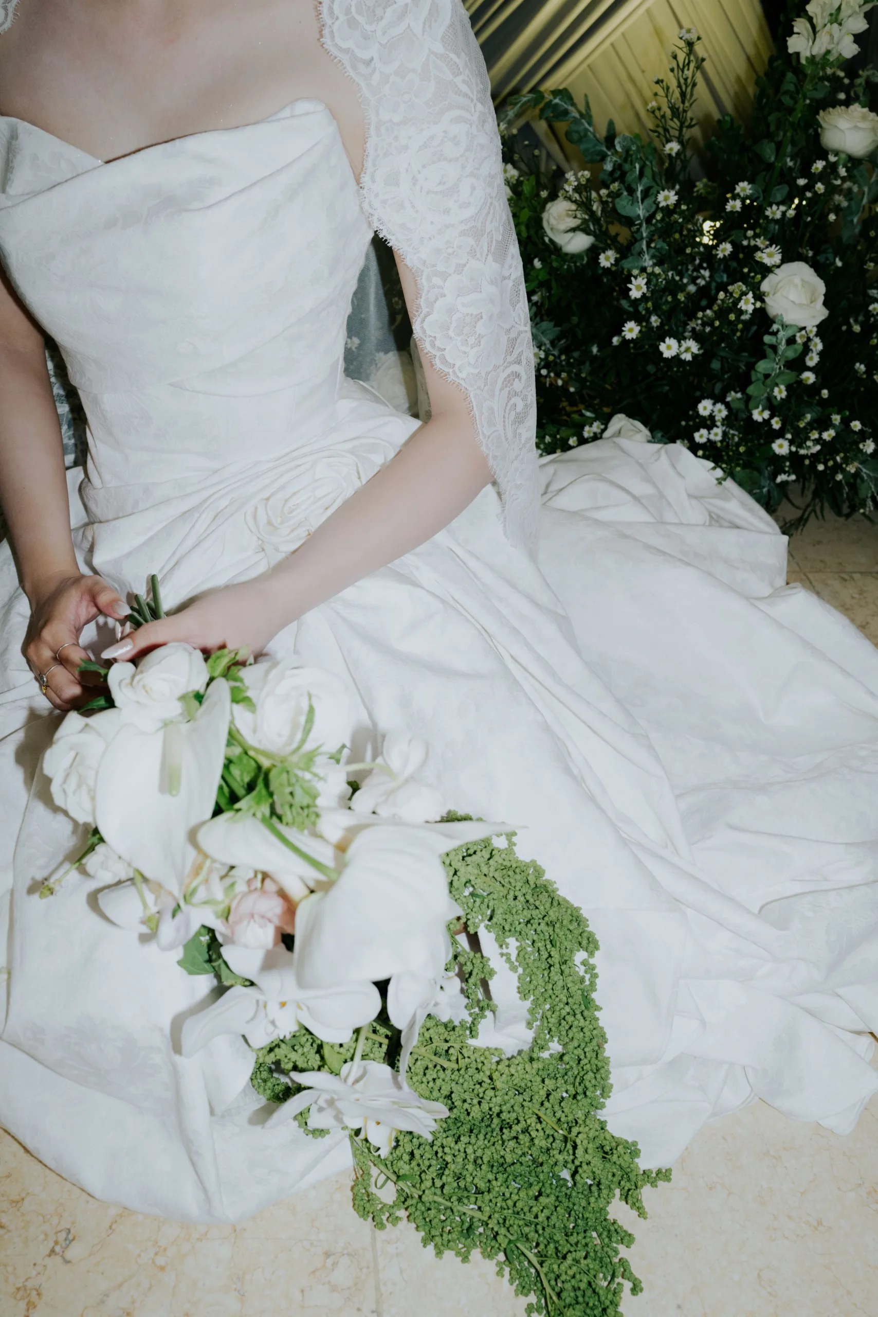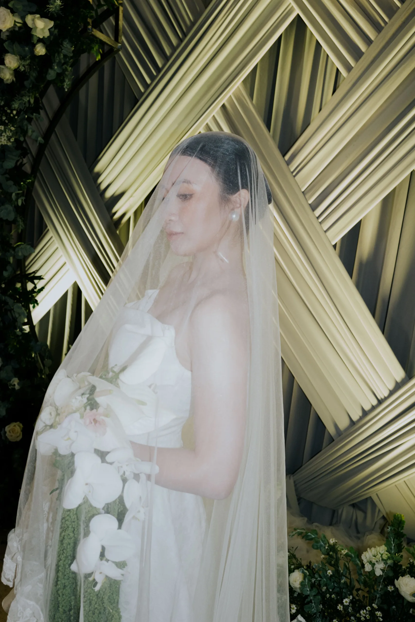 Cô dâu dịu dàng với tà áo dài trắng họa tiết cổ điển, cùng chú rể rạng rỡ dẫn đầu đoàn rước lễ