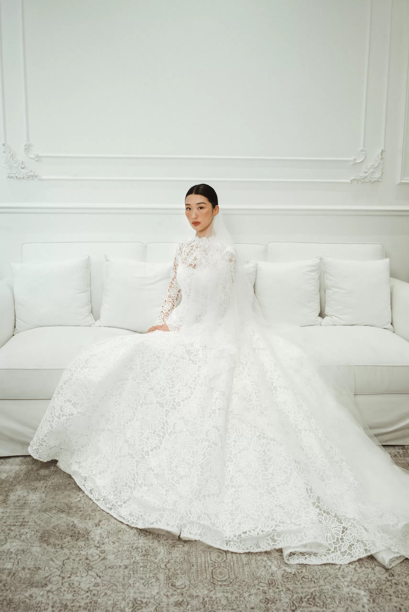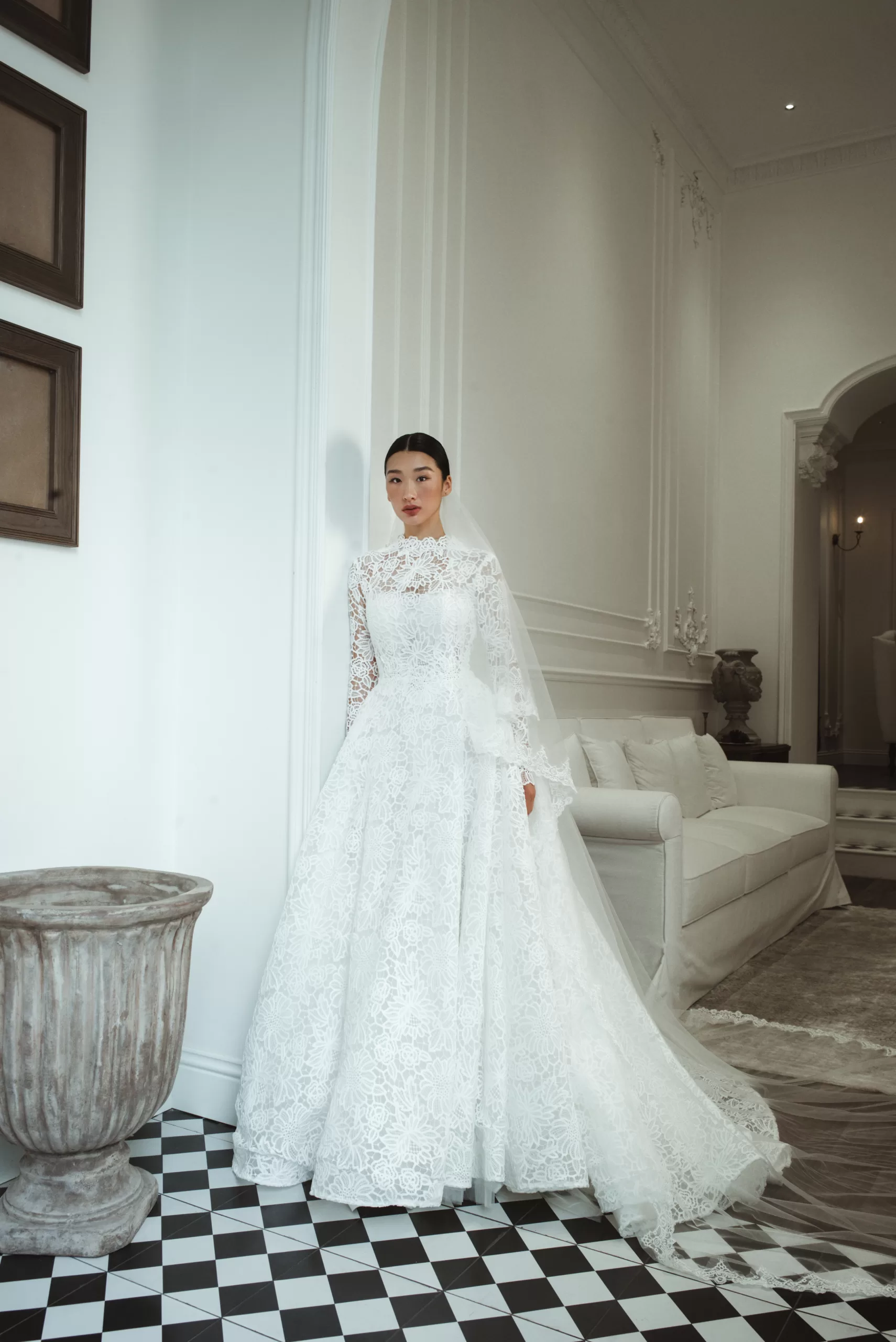 Chiếc váy cưới ren nổi tinh xảo với thiết kế tay dài và cổ cao kín đáo, mang đến vẻ đẹp