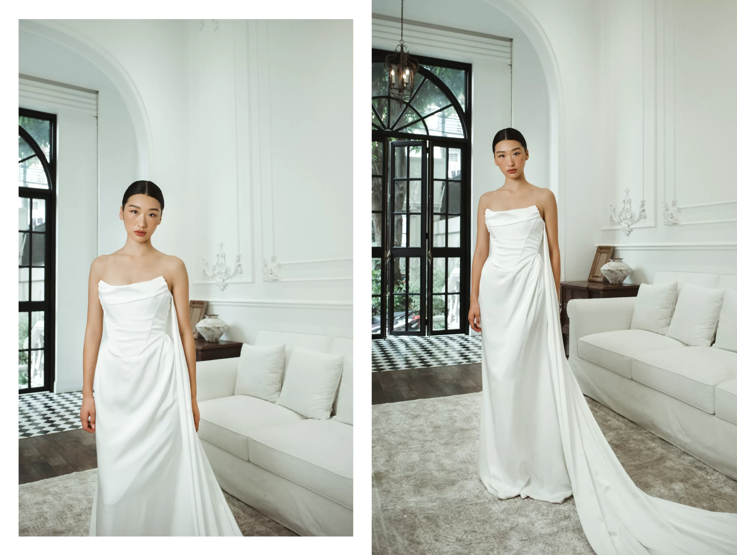 Váy cưới satin mềm mại với dáng cúp ngực suông tinh tế, khéo léo tôn lên bờ vai
